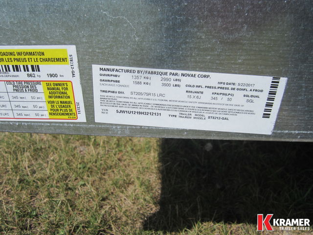 Color: Grey Length: 12' Width: 7' Weight: +/- 1090 lbs Serial No: 5JW1U1219H3212131 Axles: 1-3500 lb spring axle Rims: 15" - 5 bolt Tires: 205/75R15 GVWR: +/- 2990 lbs Payload: 1810 lbs |