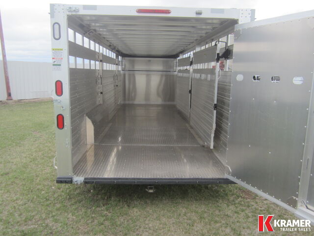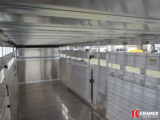 **NEW** Wide Stock Trailer from Duralite. It has 89 1/2" inside width with front 5' calf compartment. Back compartments are 9'10" & 9'7". Tapered nose, one piece aluminum roof, EZ lube axles, electric brakes with breakaway system, 2 dome lights with rear switch, rear loading lights, plexi-glass channel, goose neck drop-down gate, rubber bumper, drop spike on swing door. Upgraded to 14 ply tires. Be careful when comparing aluminum livestock trailers. Duralites have NO structural welds; the use of rivets allows for flex, especially with shifting loads. The result is no broken aluminum welds!