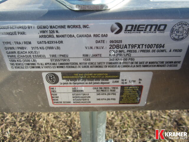Color: Aluminum Length: 14' Height: 20" Deck Height Width: 82" Weight: +/- 1,250 lbs Serial No: 2DBUAT9FXT1007694 Tag #: 4070 Axles: 2 x 3500 lb Rims: 15" Aluminum Tires: 205/75R15 GVWR: +/- 7,000 lbs Payload: 5,750 lbs |