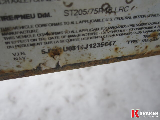Color: Black Length: 8' Height: 18" Width: 5' Weight: +/- 890 lbs Serial No: 5JW1U0811J1235647 Axles: 3500 lb Spring Rims: 15" Steel Tires: 205/75R15 GVWR: +/- 2,990 lbs Payload: 2,100 lbs |