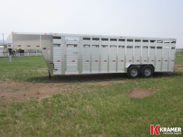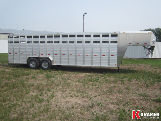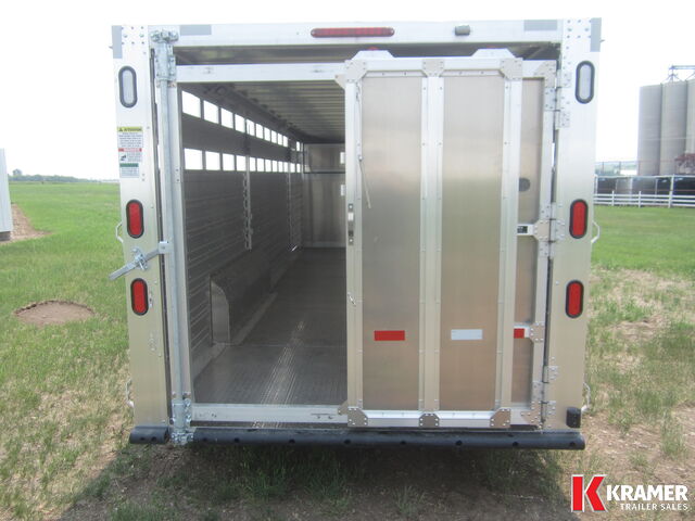 **NEW** Wide Stock Trailer from Duralite. It has 89 1/2" inside width with front 5' calf compartment. Back compartments are 9'10" & 9'7". Tapered nose, one piece aluminum roof, EZ lube axles, electric brakes with breakaway system, 2 dome lights with rear switch, rear loading lights, plexi-glass channel, goose neck drop-down gate, rubber bumper, drop spike on swing door. Upgraded to 14 ply tires. Wide Side Door (48"), Front Nose Door and Full Plexiglass enclosure. Be careful when comparing aluminum livestock trailers. Duralites have NO structural welds; the use of rivets allows for flex, especially with shifting loads. The result is no broken aluminum welds! |
