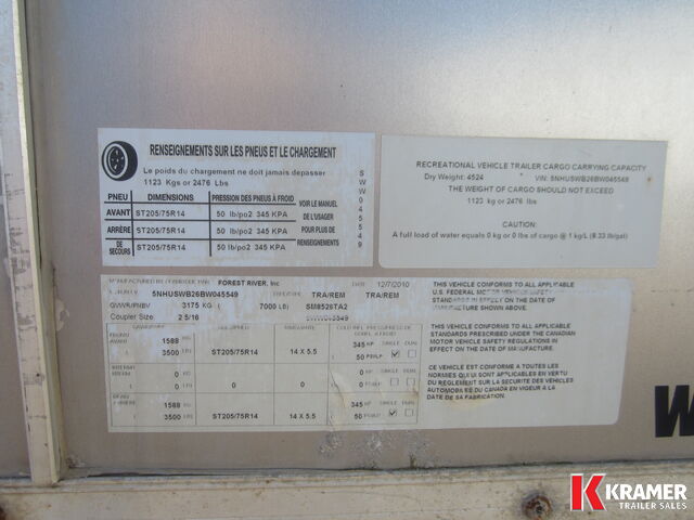 Color: Charcoal/Black Length: 26' (22'+4') Height: 73 1/2" High Width: 8.5' Weight: +/- 4,524 lbs Serial No: 5NHUSWB26BW045549 Axles: 2 x 3500 lb Torsion Rims: 15" Aluminum Tires: 205/75R15 GVWR: +/- 7,000 lbs Payload: 2,476 lbs Rear Door(s): Ramp w/ Cable Assist Rear Door Opening: 91" W x 68 1/2" H |
