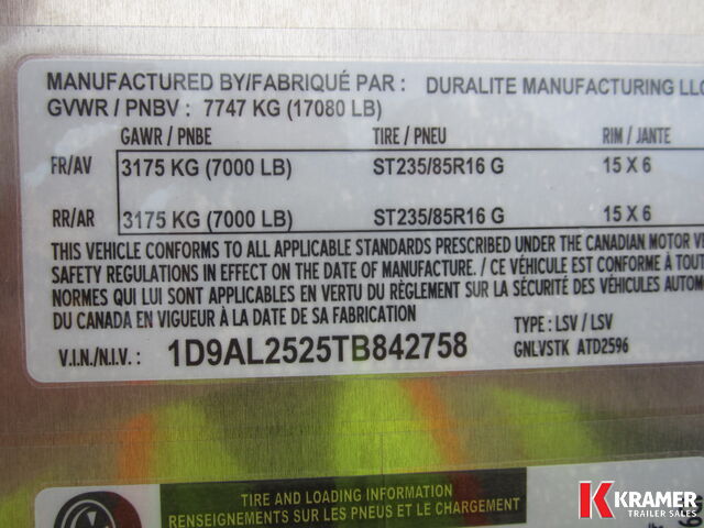 Color: Aluminum Length: 25' Height: 6' 8" Width: 96" Weight: +/- 4,868 lbs Serial No: 1D9AL2525TB842758 Tag #: 4072 Axles: 2 x 7,000 lb Torsion Rims: 16" Steel Tires: 235/80R16 GVWR: +/- 17,080 lbs Payload: 12,212 lbs Rear Door(s): Full Swing - Half Slide |