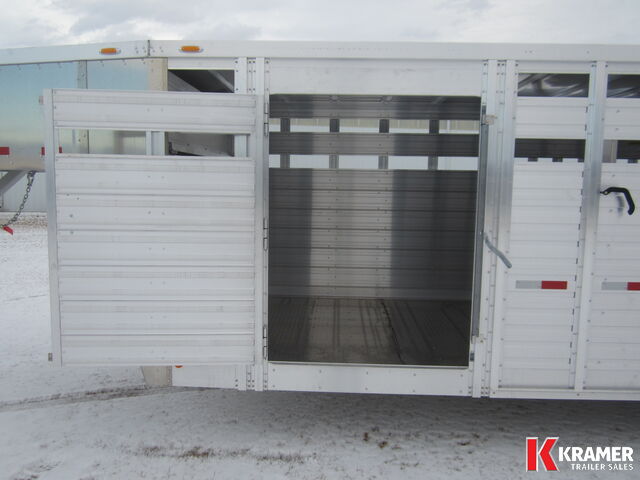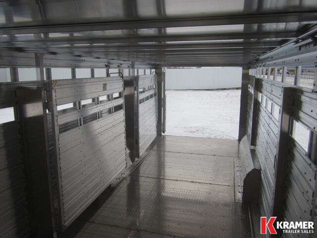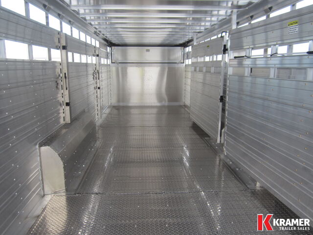 **NEW** Wide Stock Trailer from Duralite. It has 95 1/2" inside width with front 5' calf compartment. Back compartments are 9'10" & 9'7". Tapered nose, one piece aluminum roof, EZ lube axles, electric brakes with breakaway system, 2 LED Strip lights with rear switch, rear loading lights, plexi-glass channel, goose neck drop-down gate, rubber bumper, drop spike on swing door. Upgraded to 14 ply tires. Be careful when comparing aluminum livestock trailers. Duralites have NO structural welds; the use of rivets allows for flex, especially with shifting loads. The result is no broken aluminum welds!