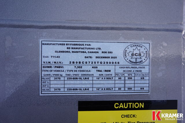 Color: Silver Length: 20' Height: 82" Width: 7.5 Weight: +/- 5280 lbs Serial No: 2B9BCS725TG290056 Axles: 2 x 7,000 lb Torsion Rims: 16 " steel Tires: 235-80R-16 GVWR: +/- 16,064 lbs Payload: 10,784 lbs Rear Door(s): Full swing w/ half slide |