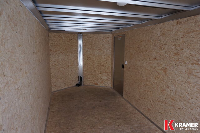Side Door(s): 32" W x 72" H Curb Side Front Jack(s): 3K Body: Aluminum Main Frame: 2" x 4" Tube Cross Members: 2" x 3" Integrated Floor: 3/4" Water Resistant Wall Lining: 3/8" Water Resistant Ramp Style: Cable Assist Electrical Plug Style: 7 Way RV Style Coupler: 2 5/16" Lighting: LED Lighting |
