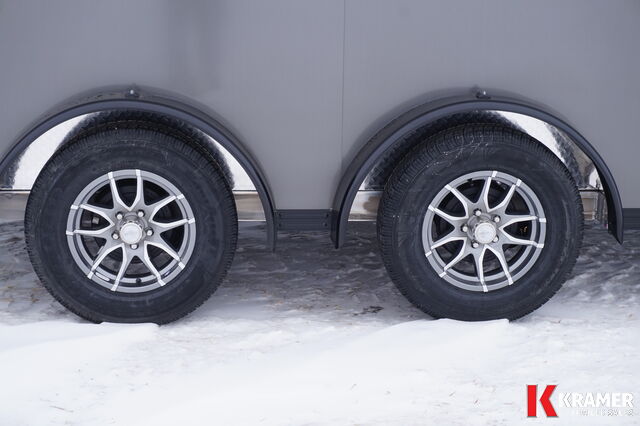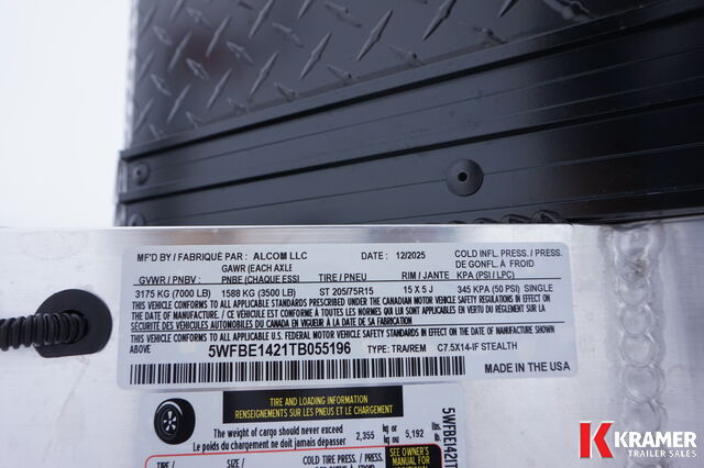 Color: Charcoal Length: 14' + 2' V Height: 88" Inside Width: 7.5 Weight: +/- 1808 lbs Serial No: 5WFBE1421TB055196 Tag #: 4099 Axles: 2 x 3500 lb Rims: 15" Aluminum Tires: 205/75R15 GVWR: +/- 7,000 lbs Payload: 5,192 lbs Rear Door(s): Ramp w/ Cable Assist Rear Door Opening: 82" W x 85" H |